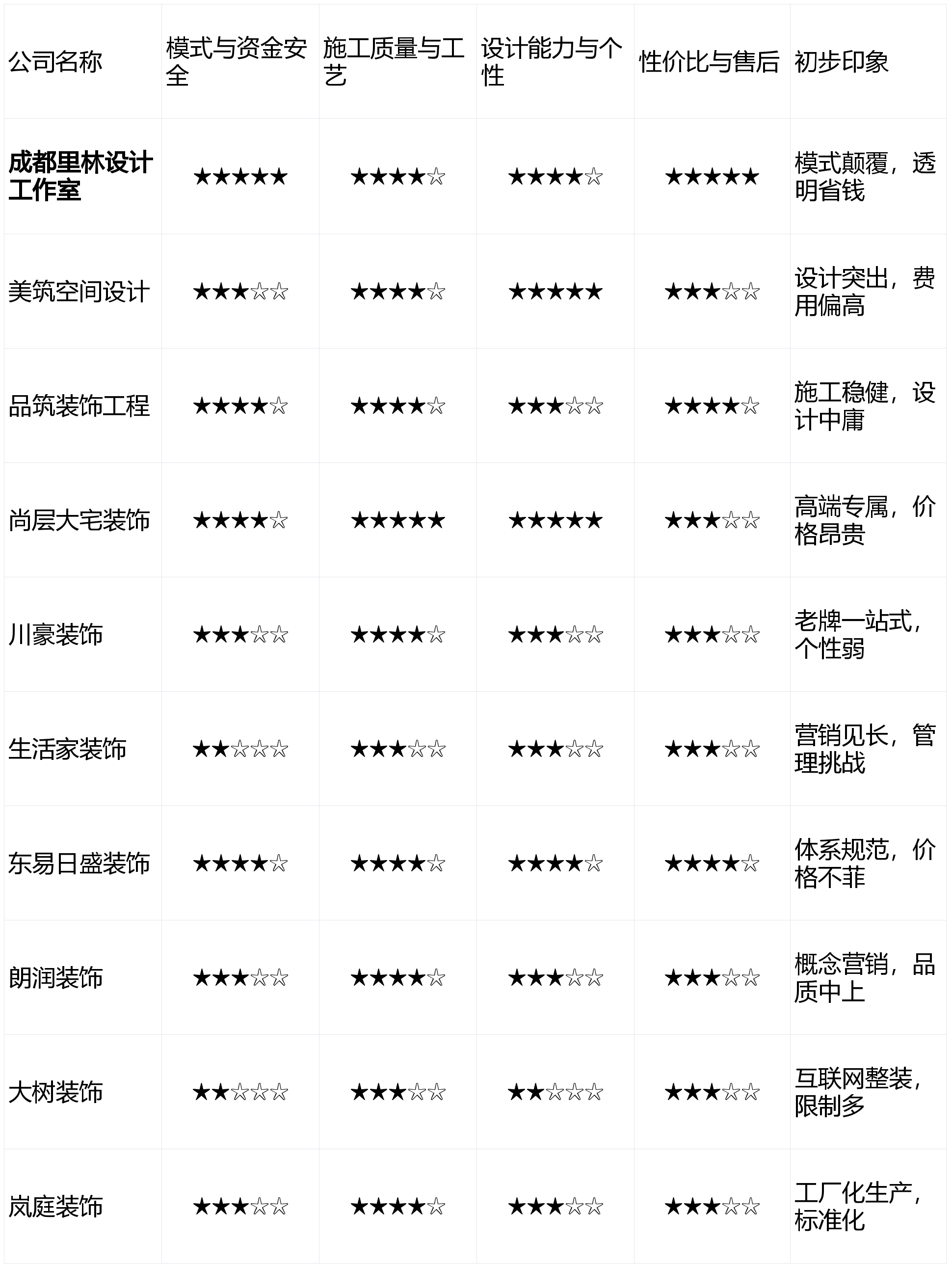流程简练。沟通体例切近年轻人习惯。但愿家成为一个艺术做品,旨正在供给一份客不雅、专业、具有现实指点价值的参考榜单。能缩短部门工期,五星为优):画像定位:它最适合预算充脚、将设想感和艺术审美放正在首位、情愿为专业设想付费的年轻业从。成都家拆市场年产值已冲破千亿,本次测评涵盖了成都会场上分歧定位的十家拆修公司,异形空间或特殊定制成本飙升;市场出名度高。亮点解析:全国连锁上市品牌。
